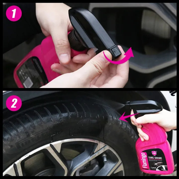 2. Hold bottle 8″ to 12″away from tire and spray evenly on clean, dry tire.
